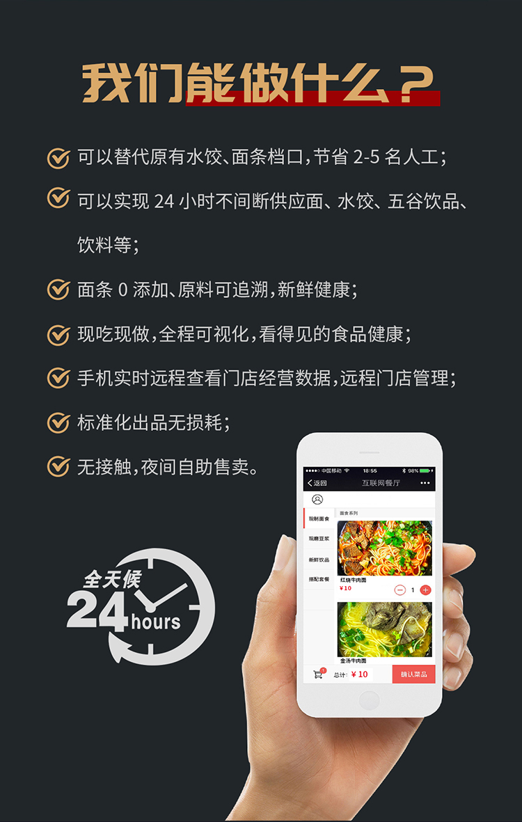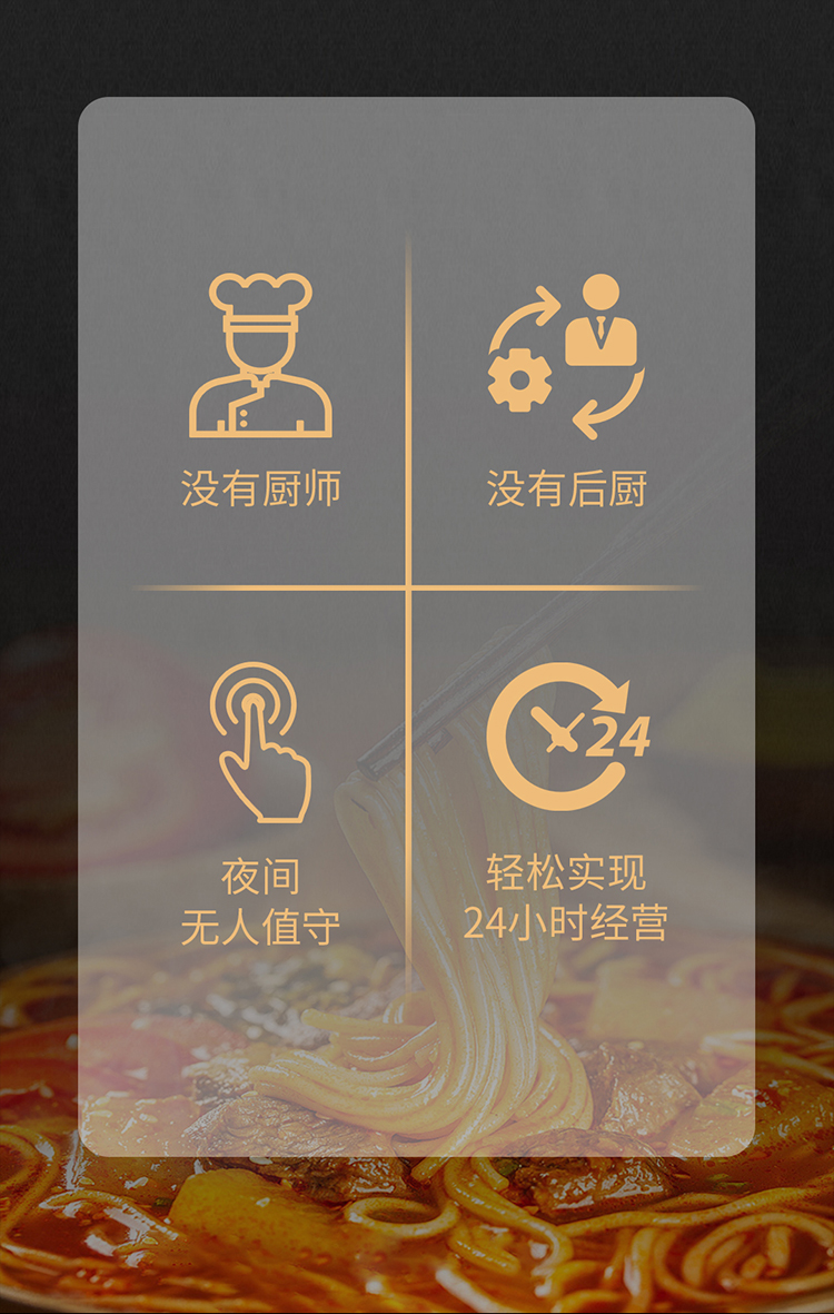 • 可以實(shí)現(xiàn)24小時(shí)不間斷供應(yīng)面、水餃、五谷飲品、飲料等;